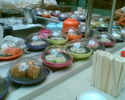 From the moment you find yourself in the vicinity, your attention is directed to the food. The entire operation is focused on providing a solution to a single problem, and doing it well – it gets food into my belly quickly by allowing self-service. The fresh food moves smoothly around the conveyor belt in a never-ending conga line, getting refilled constantly by the hard-working staff. Instead of fussing over complicated menus, making the clientele wait for a waiter to come take your order, they let you dig right in. Just what you want in a shopping centre.