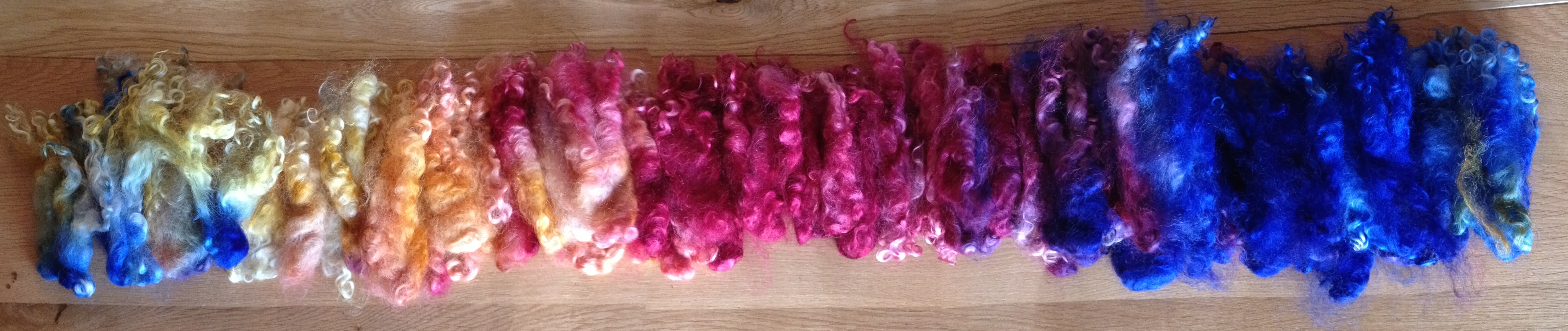 If this is the first time you experiment with rainbow dyeing, I would suggest getting a good resilient fibre that doesn’t felt too easily. I used long, curly locks of Gotland fibre. Sheep like Southdown, Ryeland and plenty more will cope with relatively rough handling without felting.